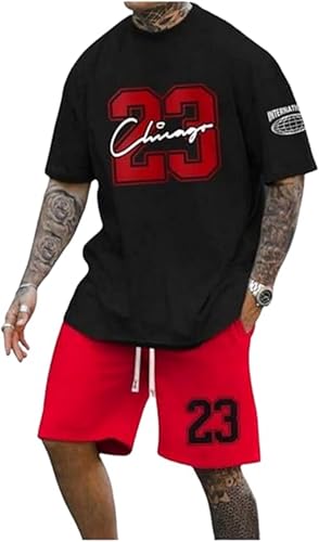 طقم رجالي رياضي كاجوال - تيشيرت مطبوع برقبة مستديرة + شورت قصير برباط، مريح وعصري للصيف للشباب والرجال من ميزة