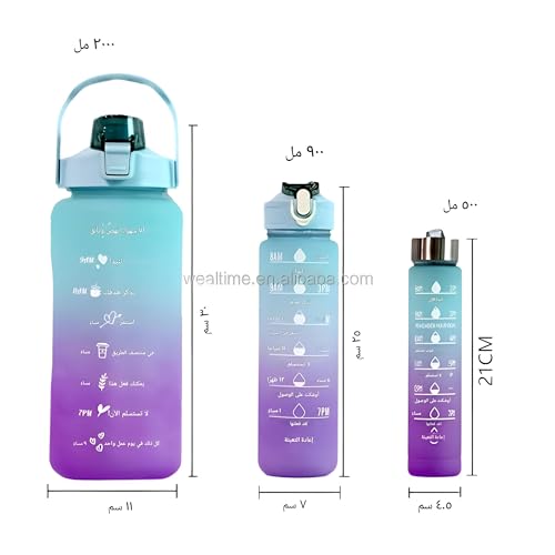 - عبّر عن شخصيتك مع زجاجات المياه التحفيزية هذه التي تأتي بألوان مختلفة لتتناسب مع جمالك الشخصي. سواء كنت بحاجة إلى زجاجة كبيرة للاستخدام المنزلي، أو خيار محمول للمكتب أو زجاجة تحفيزية للتدريبات في صالة الألعاب الرياضية، فإن هذه المجموعة ستلبي احتياجاتك. التصميم ليس عمليًا فحسب، بل يسمح لك أيضًا بإبراز شخصيتك، مما يجعل الترطيب تجربة أكثر متعة.