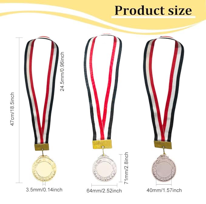 - ستحصل على 3 ميدالية مع شريط عنق. يبلغ مقاس الميداليات تقريبًا قطر 6.5 سم/2.6 انش وأربطة العنق تقريبًا الطول 40 سم/15.75 انش. مقاس وطراز أربطة العنق مثالي تقريبًا لعملك وحياتك اليومية.