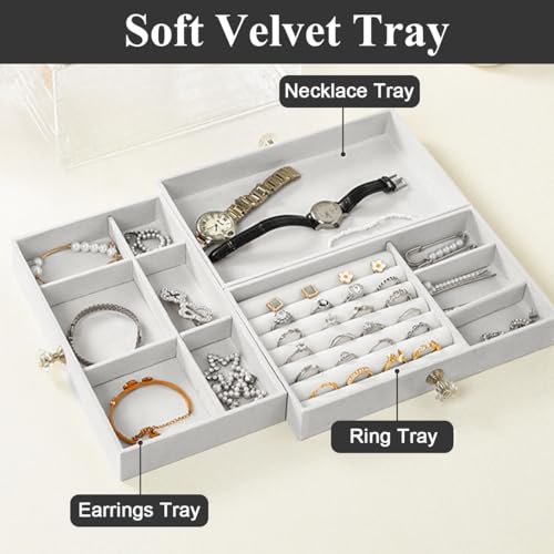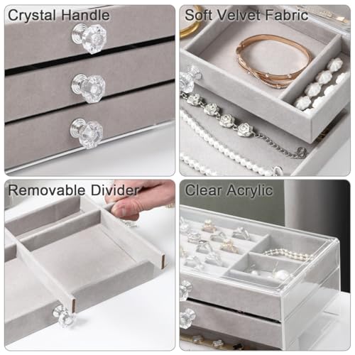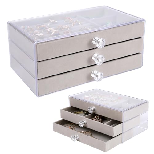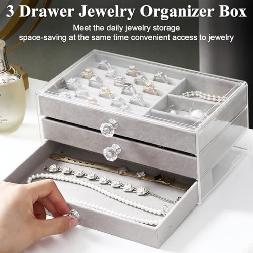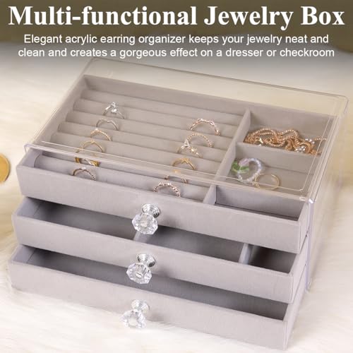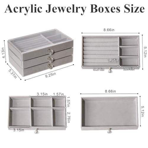 صندوق مجوهرات من الاكريليك قابل للتكديس مع 3 أدراج مخملية، منظم وعلبة عرض شفافة، ومزود بقوالب قابلة للإزالة للأقراط والخواتم والأساور والسلاسل.