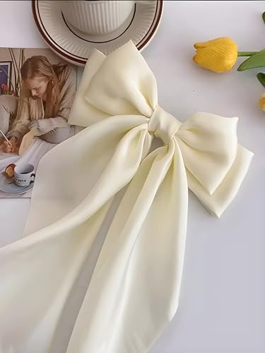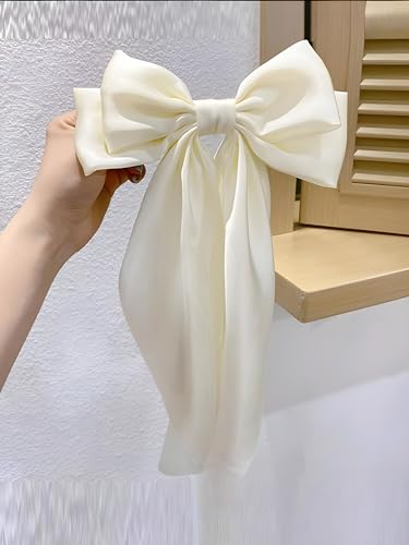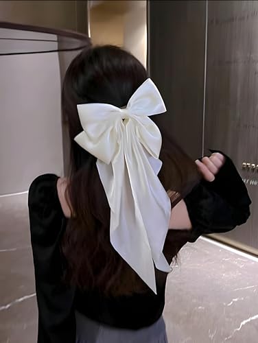 توكة شعر كبيرة بطول طويل على شكل فيونكة مصنوعة من الساتان الناعم الحريري اكسسوارات شعر أنيقة للبنات والنساء، لون أبيض، قطعة واحدة