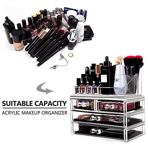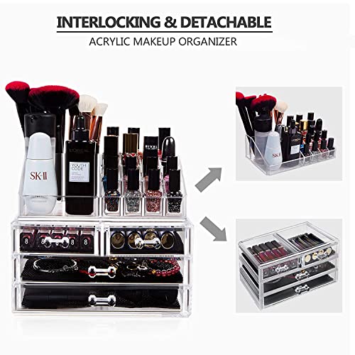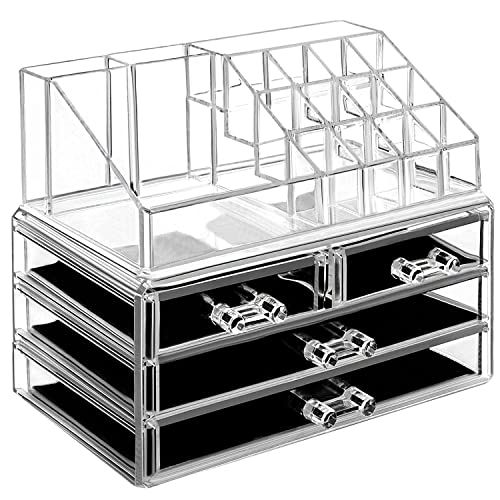 - 【منظم تخزين شفاف لمستحضرات التجميل】طريقة عرض مثالية للاحتفاظ بجميع المجوهرات ومستحضرات التجميل في مكان واحد. يحتوي القسم العلوي على 4 مساحات تخزين متعددة الأحجام و12 فتحة لحمل أحمر الشفاه، أما القسم السفلي فيتضمن 4 أدراج، يأتي كل درج مع بطانة شبكية سوداء قابلة للإزالة تحافظ على العناصر الداخلية محمية في مكانها.