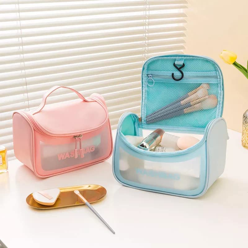 شنطة مكياج كبيرة متعددة الوظائف من بلاستيك PVC مقاومة للماء بخطاف للنساء والبنات شاكتيسم منظم سفر لتخزين الغسيل ومستحضرات تجميل وأدوات الزينة واكسسوارات الحمام ومجموعة العناية الشخصية وردي