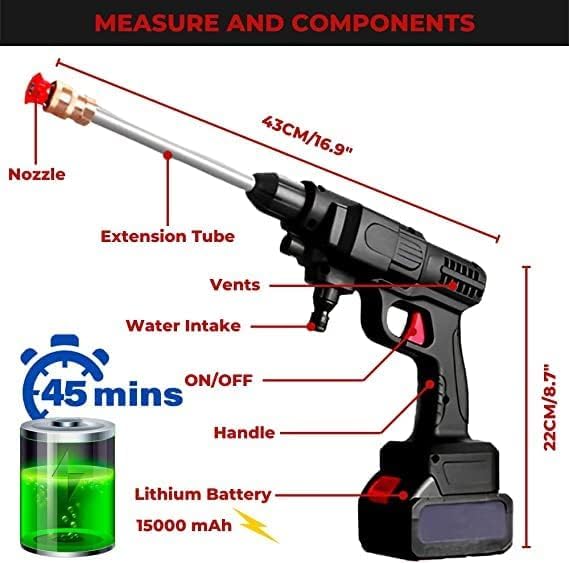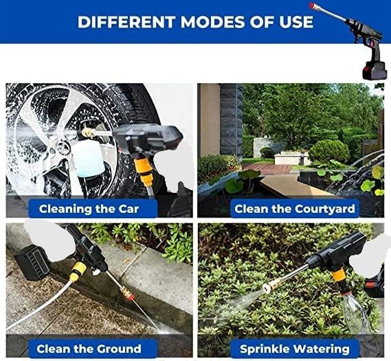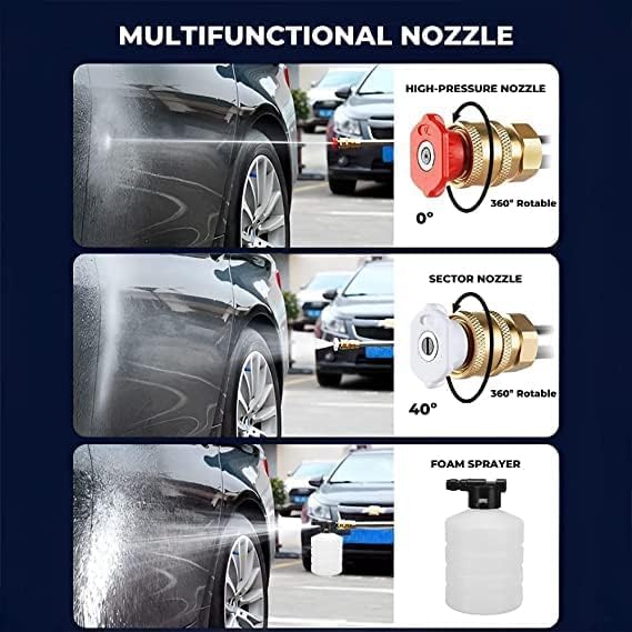 - مسدس غسيل بالضغط اللاسلكي قابل للتعديل مزود بـ 4 فوهات مختلفة: 0 درجة، 25 درجة، 40 درجة، 65 درجة. يمكنك اختيار فوهات مختلفة لضبط قوة تدفق الماء لتوفير الماء. بالإضافة إلى ذلك، يتميز مسدس صابون غسيل السيارات الخاص بنا بعلبة رش رغوة الصابون للتنظيف العميق للسيارة