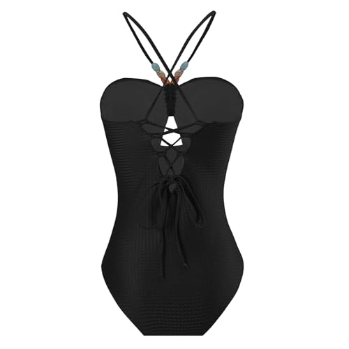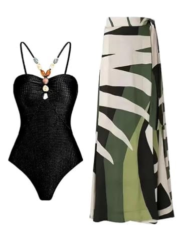 طقم ملابس سباحة من قطعتين مع ملابس سباحة نسائية من قطعة واحدة وسارونج بطبعة هندسية وفتحة رقبة على شكل هالتر مزينة بالخرز