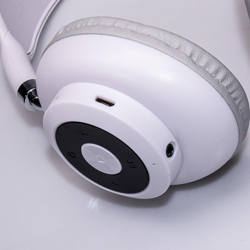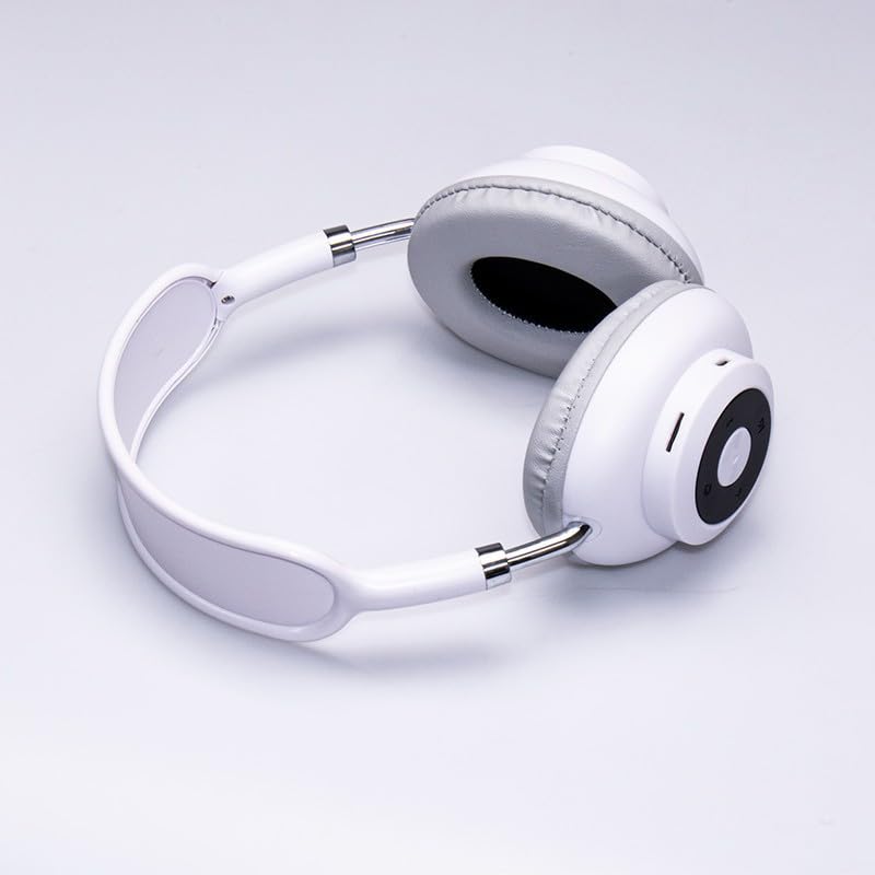 - تصميم لاسلكي: سماعات رأس بلوتوث فوق الأذن تتميز بجزء خارجي أبيض أنيق مع لمسات من الكروم وشريط رأس مبطن مريح للارتداء لفترة طويلة