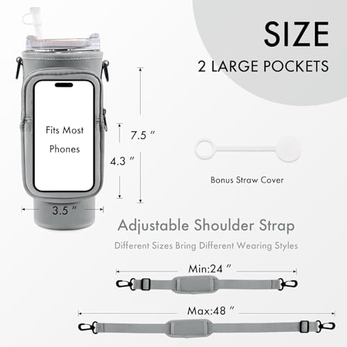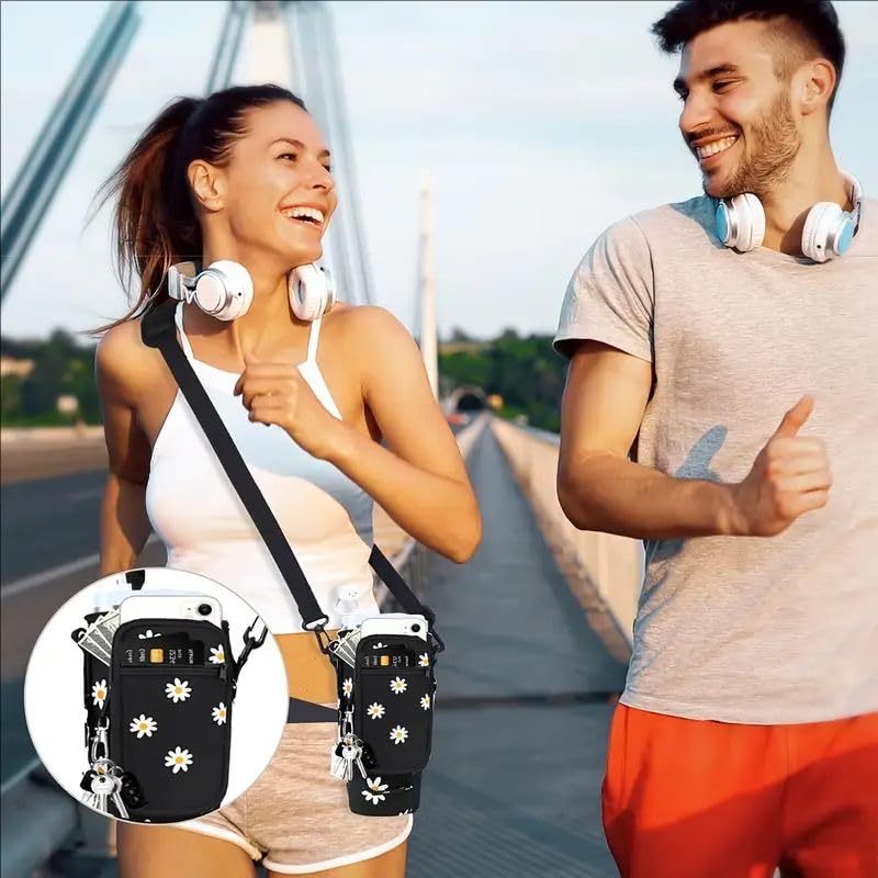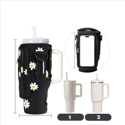 جي كيو حقيبة حمل زجاجات المياه مع جيب للهاتف لكوب ستانلي بسعة 40 اونصة، حامل زجاجة مياه مع حزام قابل للتعديل وغطاء ماصة، ملحقات كوب ستانلي (اسود ديزي)