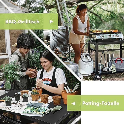 - الثبات- أربعة أرجل أنبوبية متينة مع هيكل أنبوب فولاذي أسود توفر أقصى مقاومة للرياح والطقس. تحتوي ترابيزة الزراعة المعدنية أيضًا على 3 خطافات إضافية قابلة للإزالة يمكنك وضع الفرش أو المجارف أو أدوات المطبخ الضرورية الأخرى.