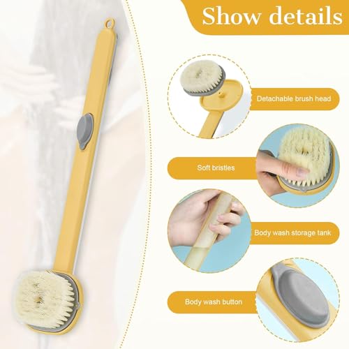 - 🧴 فرشاة غسيل جسم قابلة للتخزين: يمكن لإعادة ملء غسول الجسم داخل المقبض الطويل. زر مريح لتسهيل الفتح والإغلاق. اضغط بلطف وسيتدفق غسول الجسم من رأس الفرشاة عند الاستحمام. نقترح عليك صب غسول جسم مناسب.