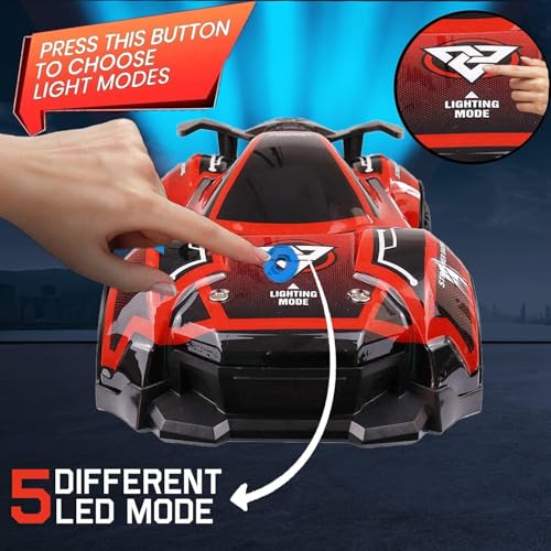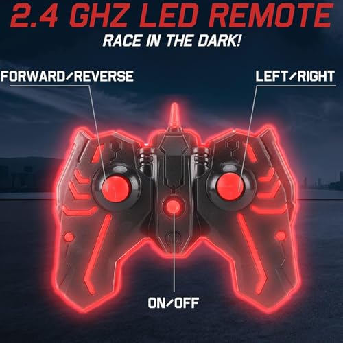 - تتميز لعبة سيارة LED بـ 5 أوضاع إضاءة من الأضواء الوامضة والوامضة. يضيء جهاز الإرسال أيضًا لمزيد من المرح في الظلام!