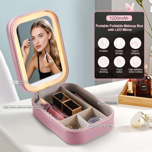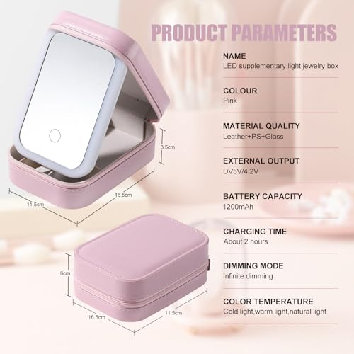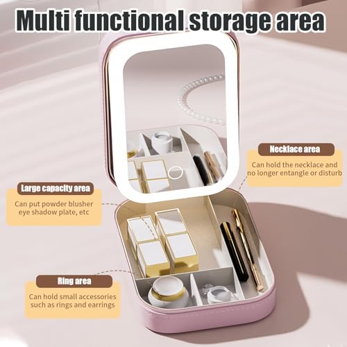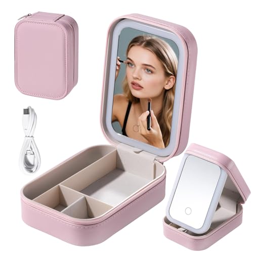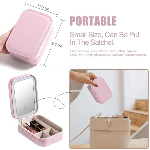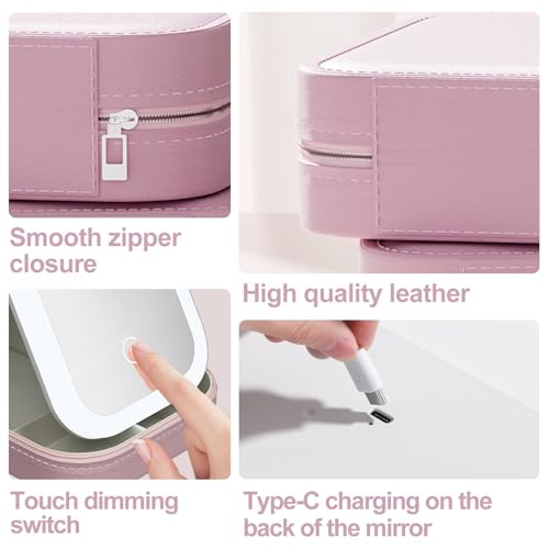 حافظة مراة مستحضرات التجميل للسفر مزودة باضاءة LED لتخزين فرش الرموش وادوات التجميل بلون زهري واحتياجات المكياج اثناء التنقل (بينك)