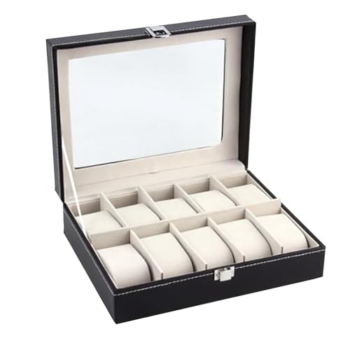 صناديق تخزين ساعات قابلة للقفل من جلد البولي يوريثين بـ12 فتحة اف دبليو تي بووم حافظة درج لعرض المجوهرات منظم طبقتين مع غطاء زجاجي ووسادة اسود
