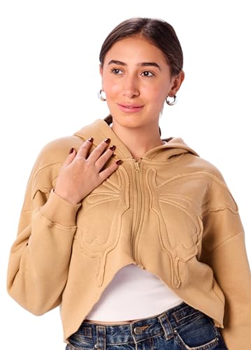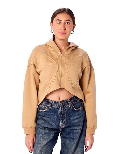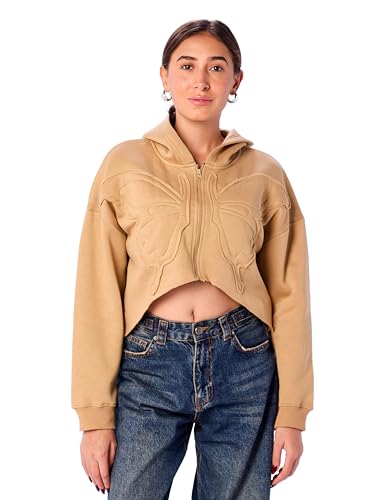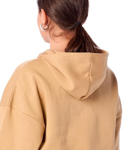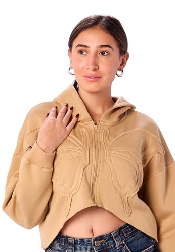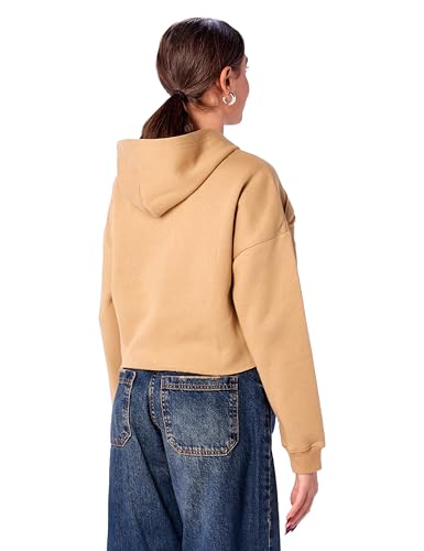 سويت شيرت قصير بغطاء للرأس للنساء بقصة مريحة مطبوع عليه كلمة "Butterfly" من ريفين، لون بيج