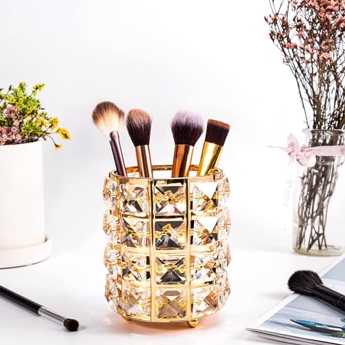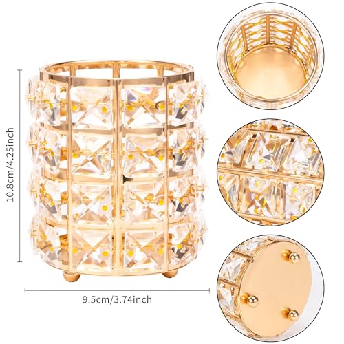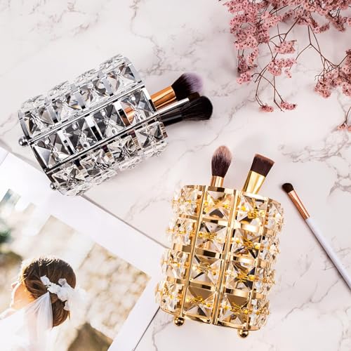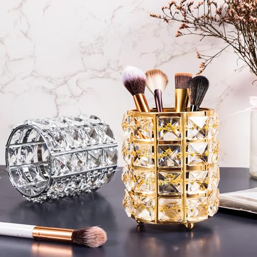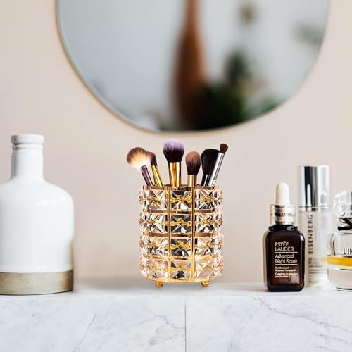 حامل فرش مكياج كريستال أنيق، منظم طاولة زينة لتخزين مستحضرات التجميل، كوب أقلام مطلي بالذهب لإضفاء البهجة على مكتبك