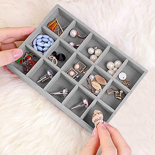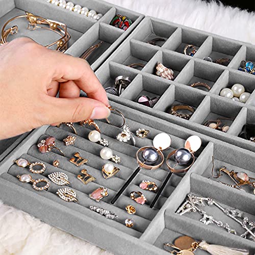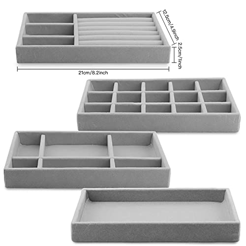 مجموعة صواني تنظيم المجوهرات من القطيفة قابلة للتكديس لعرض المجوهرات في الأدراج، تستخدم لتنظيم وتخزين المجوهرات والحلقان والسلاسل والأساور والخواتم من لينرو، 4 قطع (لون رمادي)