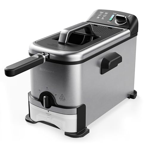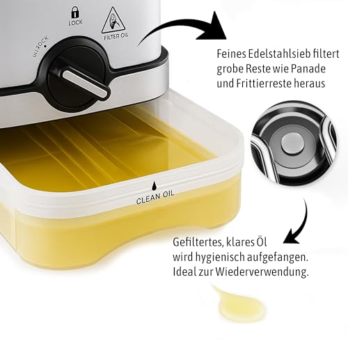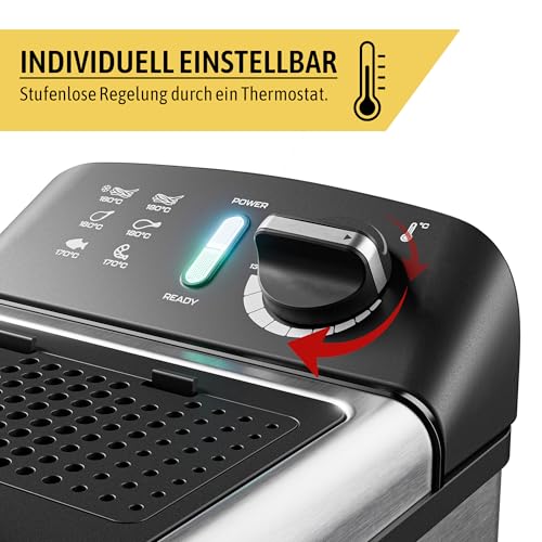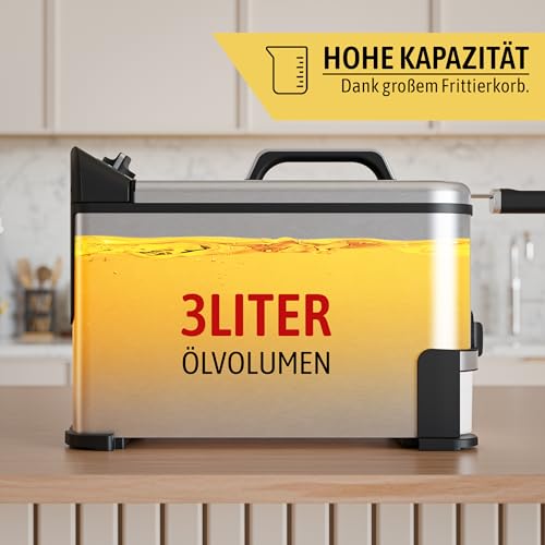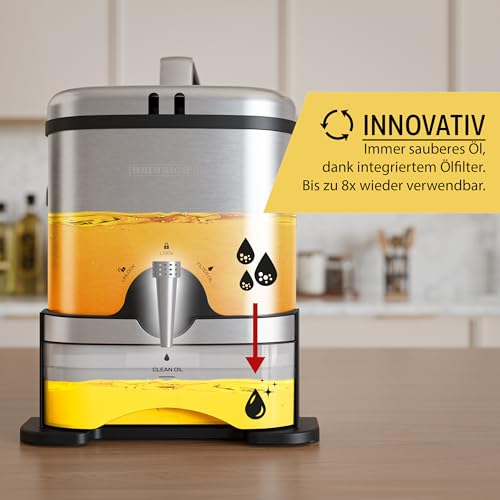 قلاية بسعة 3 لتر وقوة 2000 وات من الفولاذ المقاوم للصدأ القوي، سهلة الاستخدام بدرجة حرارة تصل إلى 190 درجة مئوية، طلاء داخلي غير لاصق مع نظام فلترة الزيت وترموستات قابل للتعديل ومؤشر ضوئي من هاينريش