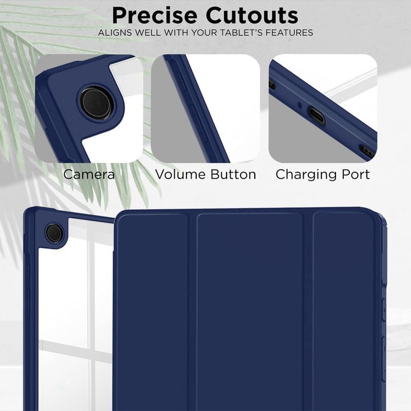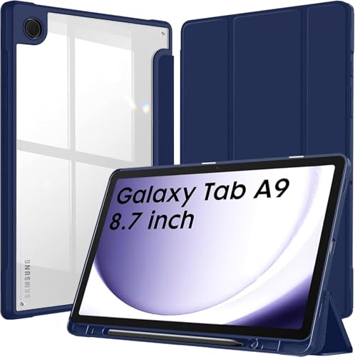 جراب حماية ناعم من البولي يوريثين المقاوم للحرارة ثلاثي الطيات بخاصية التشغيل/النوم التلقائي من فكرة، مع حامل قلم ومسند خلفي لتابلت سامسونج جالاكسي A9 8.7 بوصة (أزرق) - (SM-X110/X115/X117)