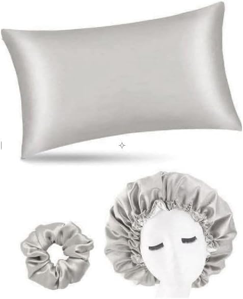 - مجموعة كاملة: كيس مخدة من الساتان الحريري، يأتي مع بونيه نوم متناسق وتوكة شعر، متوفر بلون رمادي فضي أنيق