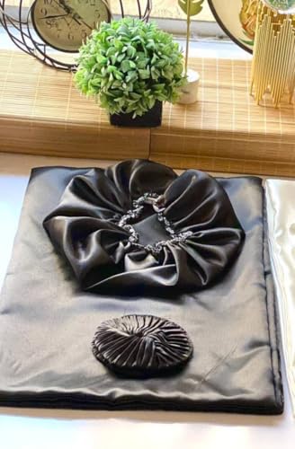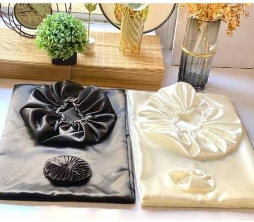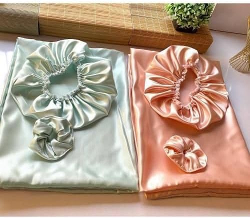طقم أكياس مخدات من الساتان الحريري مع بونيه للرأس ورباط شعر (بونيه للرأس - كيس مخدة - توكة شعر) اختيار اللون عشوائي