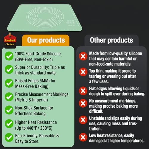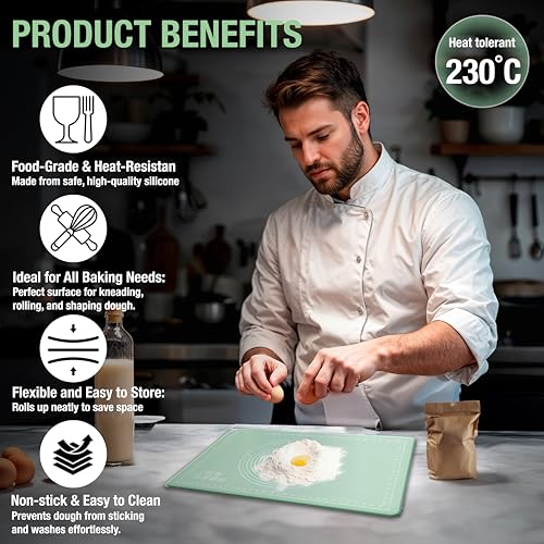 - 🔥 مقاوم للحرارة حتى 230 درجة مئوية. تم تطويره لحماية فائقة من الحرارة. مثالي للخبز ولف العجين وحماية أسطح الطاولات من المقالي الساخنة.