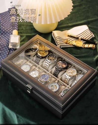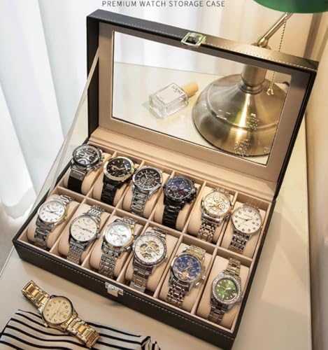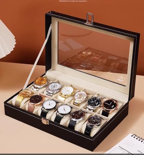 حافظة عرض فاخرة للساعات، صندوق تخزين منظم بـ 12 فتحة مع جزء علوي زجاجي، لمسة نهائية من الجلد