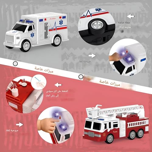 - تتضمن مجموعة ألعاب مركبات الطوارئ أربع مركبات واقعية: سيارة شرطة، طائرة هليكوبتر للشرطة، سيارة إطفاء، وسيارة إسعاف. مصممة خصيصًا للأطفال من عمر 3 إلى 6 سنوات، توفر هذه المجموعة مجموعة متنوعة من سيارات الطوارئ لتعزيز اللعب الخيالي.