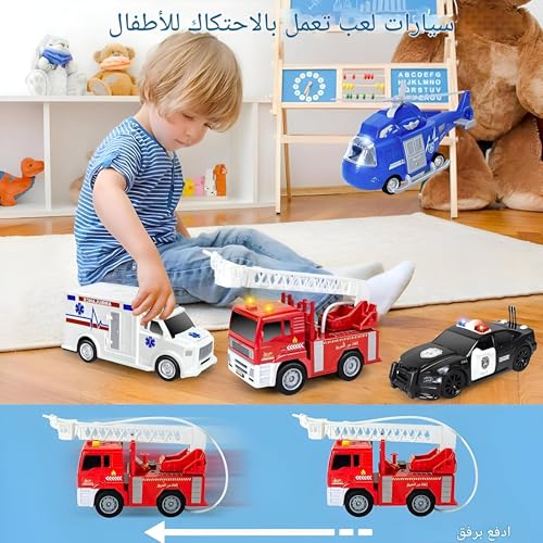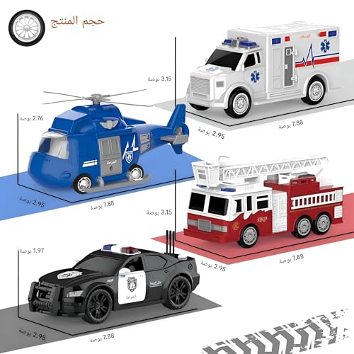 مجموعة العاب للاطفال - اربع مركبات انقاذ اصلية تعمل بالاحتكاك - شاحنة اطفاء وسيارة اسعاف وطائرة هليكوبتر ومركبة شرطة - كاملة مع تأثيرات ضوئية وصوت واقعية - مثالية للخيال واللعب