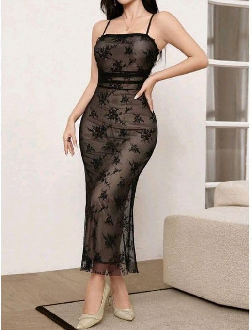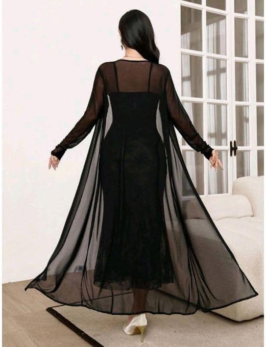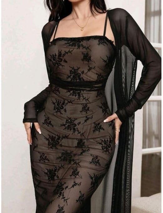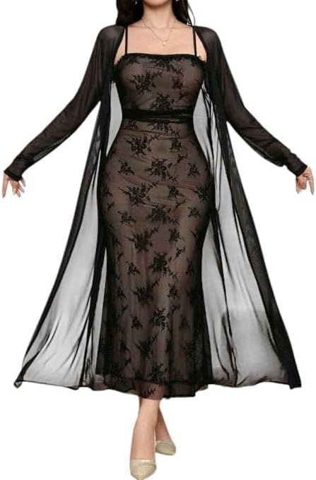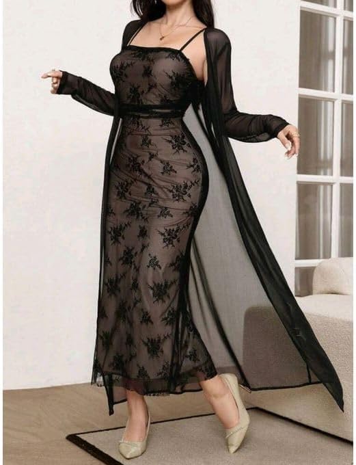 فستان شبكي من الدانتيل مزين بالزهور للنساء مع منفضة غبار شفافة طويلة، فستان كوكتيل للسهرات بلون اسود، طقم من قطعتين