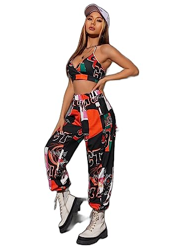 طقم ملابس للنساء مكون من قطعتين مطبوع عليه حروف وبنطلون رياضي قصير بدون ظهر
