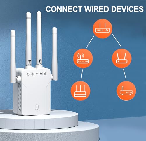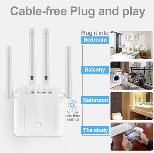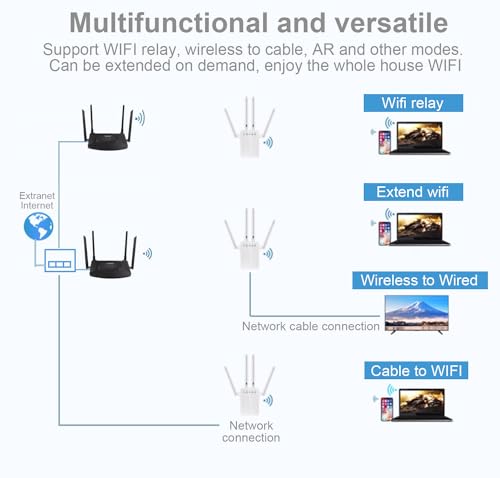 - 【مكرر واي فاي 1200 متر】يدعم مكرر الواي فاي وضع التكرار/الراوتر/ايه بي. يجمع مكرر الواي فاي بين سرعات تردد مزدوجة 5 جيجاهرتز و2.4 جيجاهرتز، حتى 1200 ميجابيكسل. تبلغ السرعة الإجمالية لمضخم الصوت واي فاي حوالي 1200 ميجابت في الثانية، مجهز بهوائي عالي الكسب 4 × 3 ديسيبل، مما يقلل من التداخل اللاسلكي ويسمح لك بالاستمتاع بفيديو عالي الدقة والألعاب والإنترنت عالي السرعة.