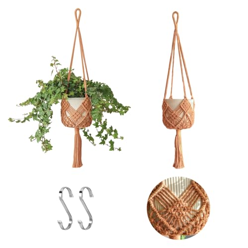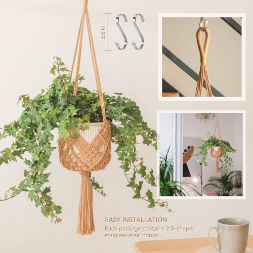 حامل نباتات معلق بأشكال مختلفة، عبوة من قطعتين من حامل النباتات المكرمية المعلق للاستخدام الداخلي والخارجي، مزود لخطافين من الفولاذ المقاوم للصدأ بتصميم على شكل حرف S (لون كراميل)