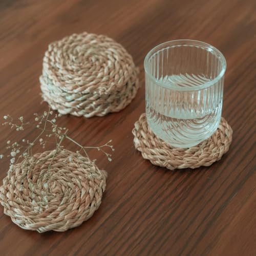 قواعد أكواب من نبات الحلف منسوجة يدويا بتصميم دائري مقاس 11 سم بلون بيج طبيعي، من 6 قطع