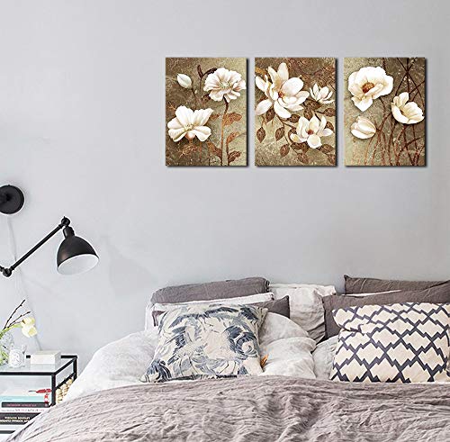 لوحة فنية للحائط من القماش الكتاني بتصميم عتيق باللون البني وزهور بيضاء، صور فنية حديثة مطبوعة ومؤطرة وجاهزة للتعليق من ييرين، مقاس 30.48 سم × 40.64 سم ومكونة من 3 قطع