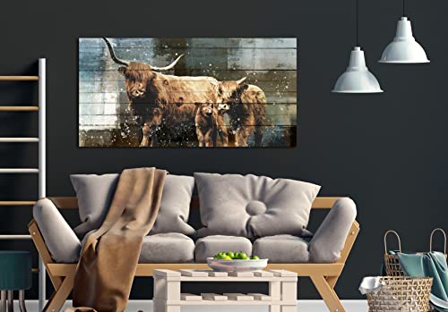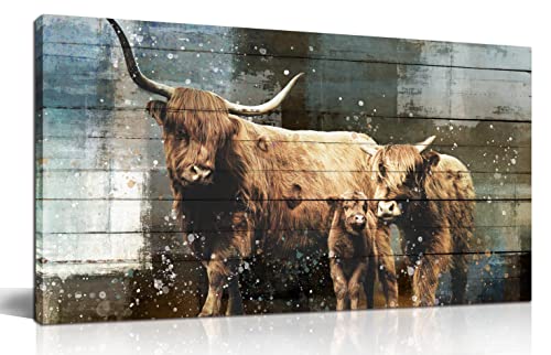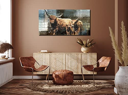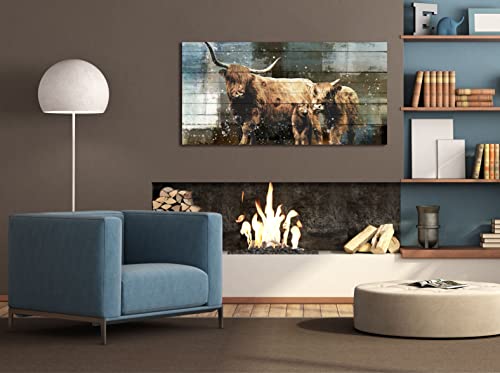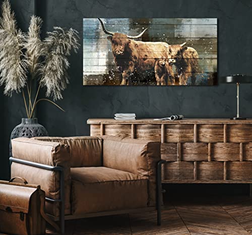 لوحة فنية جدارية كبيرة مشدودة ومؤطرة وجاهزة للتعليق من القماش بنمط ريفي بتصميم غربي لبقرة جبلية بلون بني، لديكور غرفة المعيشة وغرفة النوم، 101.6 سم عرض × 50.8 سم ارتفاع من زاوشوب