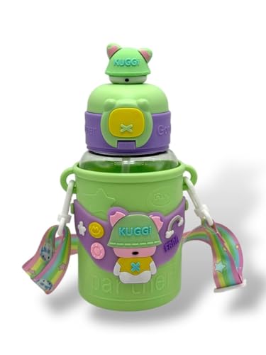 زجاجة مياه للاطفال للمدرسة مع ماصة من كيوشوب®️ بلاستيكية قابلة لاعادة الاستخدام 600 مل، حزام كتف وحامل اكواب سيليكون، مناسبة للرياضة والمدرسة للبنات والاولاد (Green)