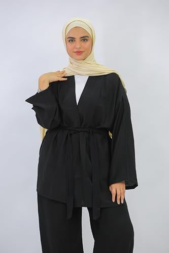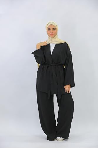 طقم كيمونو بحزام من قطعتين للنساء، بنطلون واسع الساق وبلوزة ملتفة، متوفر باللون الوردي الفاقع والأسود من فالانتينو