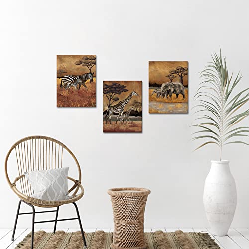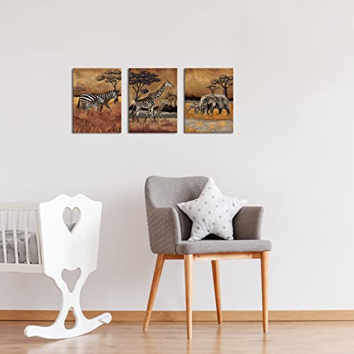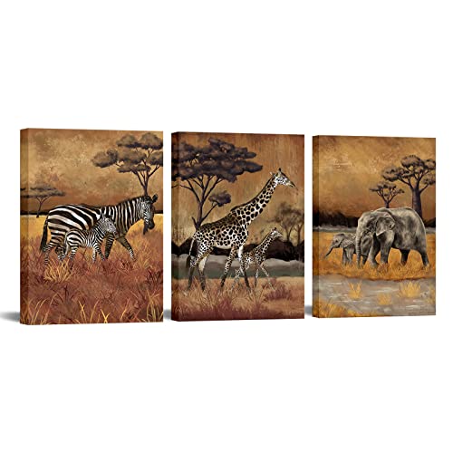 فوشفري لوحة فنية جدارية من القماش بتصميم حيوانات افريقية ممتدة ومؤطرة للام وطفلها الحمار الوحشي والزرافة والفيل لديكور المنزل والمكتب 3 قطع متعدد