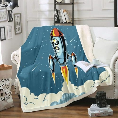 بطانية بتصميم صاروخ كرتوني للأطفال الأولاد والبنات والمراهقين، بطانية أريكة لمحبي المغامرات الفضائية والكواكب السحابية، مقاس 1.40 × 2.00 م
