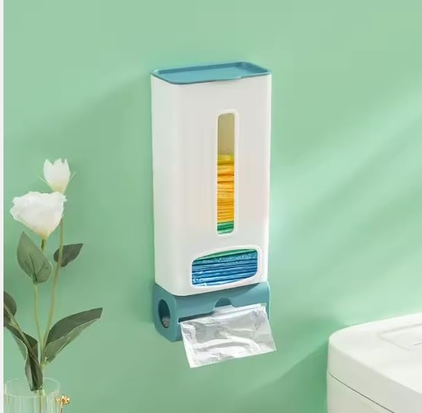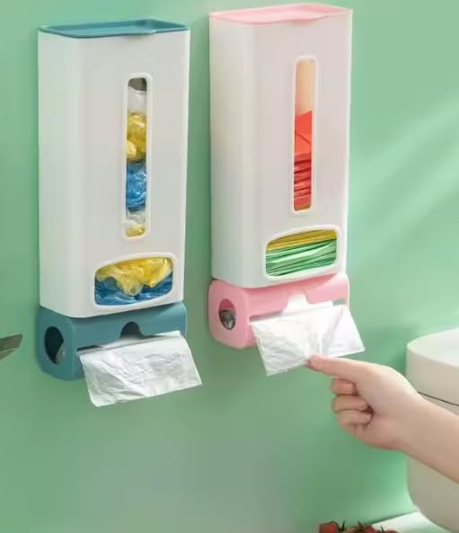 موزع اكياس بلاستيك - حامل مثبت على الحائط بلاصق قوي - منقسم لجزئين مكان لتخزين اكياس البقالة ومكان لرول الاكياس - صندوق متنوع للمطبخ والمنزل والحمام والمكتب - اللون عشوائي