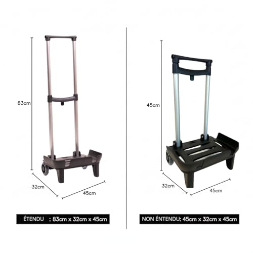 - تتكيف العربة الخاصة بنا مع احتياجاتك. مطوية، يبلغ مقاسها 45 سم فقط، مما يجعل من السهل تخزينها في المساحات الضيقة. عند فردها، يصل طولها إلى 83 سم، مما يوفر الثبات وسهولة الاستخدام. تعدد الاستخدامات في أفضل حالاتها!