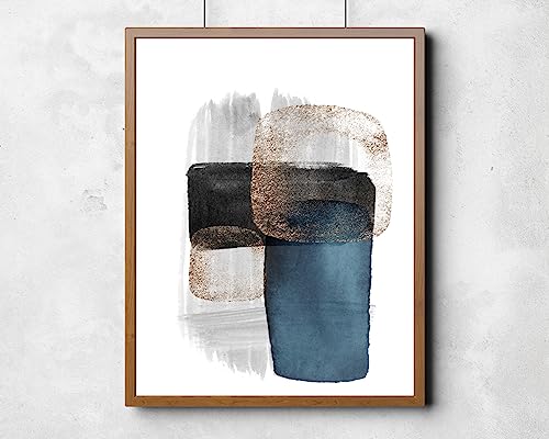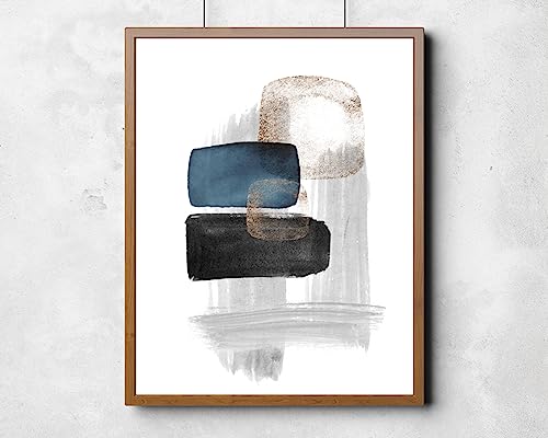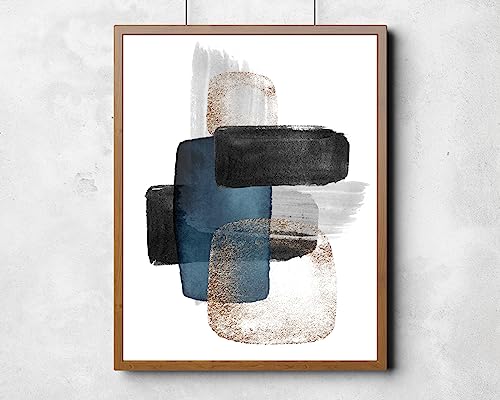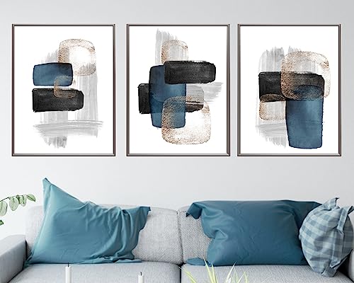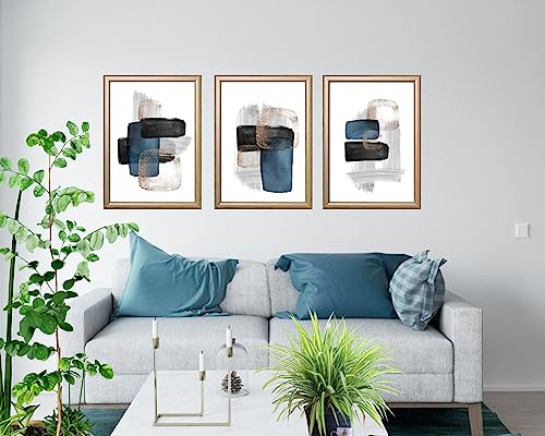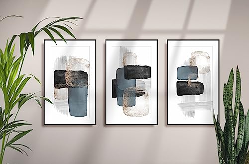 لوحة فنية تجريدية من الزجاج والخشب بإطار أسود قابلة للطباعة بألوان أسود ورمادي وأزرق وذهبي وضربات فرشاة ملونة، مجموعة من 3 قطع (مقاس 40 × 90 سم)