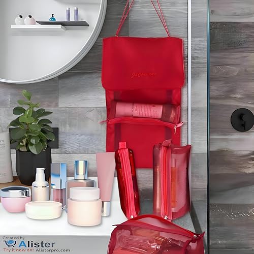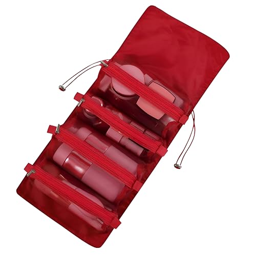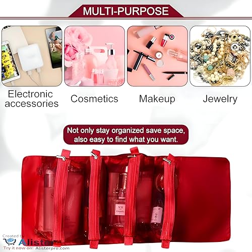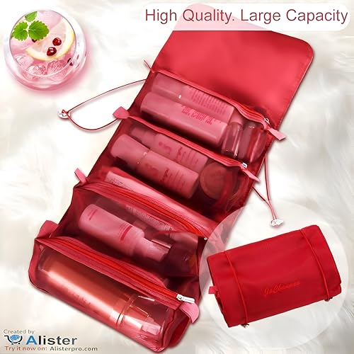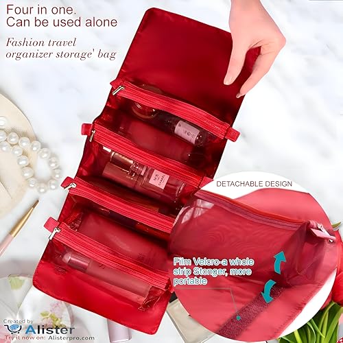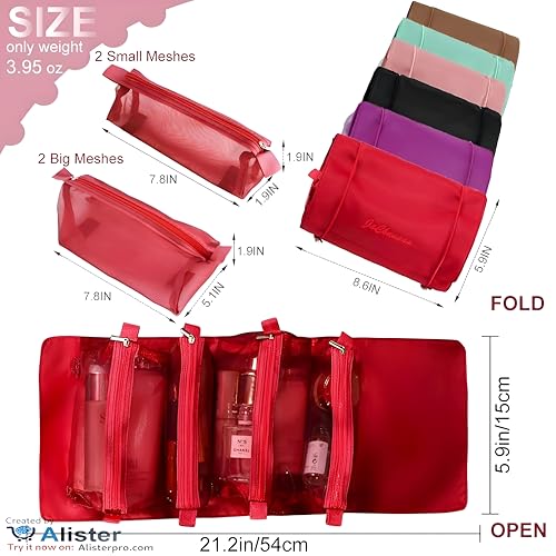 حقيبة مكياج قابلة للطي ومريحة بتصميم متعدد الاستخدامات 4 في 1، تتضمن أكياس تخزين قابلة للإزالة للسفر، أحمر