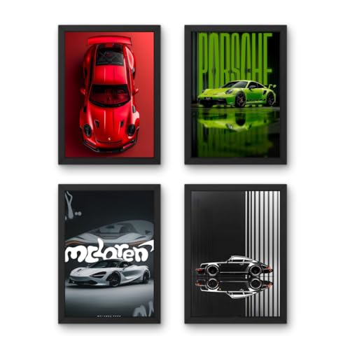 مجموعة لوحات فنية جدارية من سوبر كار، مجموعة من 4 مطبوعات مؤطرة، ملصقات بتصميم حديث للسيارات بلون أحمر وأخضر وفضي (20 × 30)