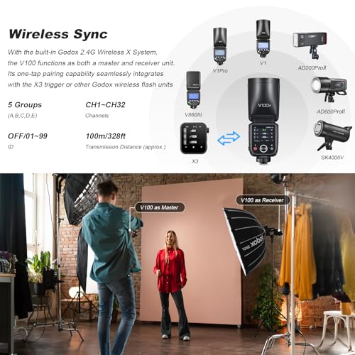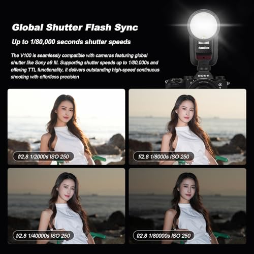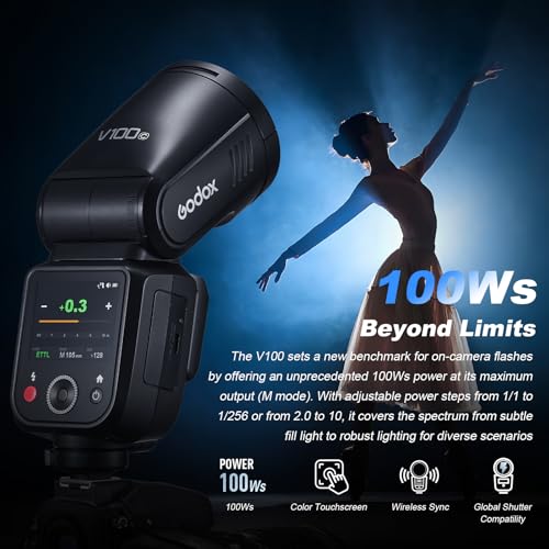 - فلاش غودوكس 100 واط، 70 طاقة كاملة: كإصدار محسن من غودوكس V1 لكانون وغودوكس V1 برو، يضع غودوكس V100 معيارًا جديدًا لمضات الكاميرا من خلال توفير أداء لا مثيل له 100 واط بأقصى طاقة (وضع M). مع مستويات طاقة قابلة للتعديل من 1/1 إلى 1/256 أو من 2.0 إلى 10. بفضل نظام التبريد المتقدم، يوفر جهاز غودوكس V100 من 70 إلى 100 ومضة متتالية بقوة 100 واط دون التضحية بالأداء.