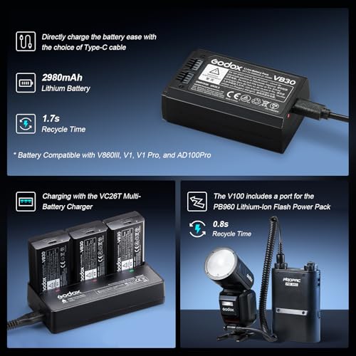 فلاش كاميرا برأس دائري سبيدلايت V100-C V100 C من غودوكس، مصباح وامض بطارية ليثيوم ايون لكاميرات كانون، 100Ws HSS 1/8000s