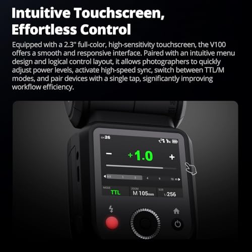 - تحكم سهل باللمس بدون مجهود: مزود بشاشة لمس ملونة كاملة 2.3 انش عالية الحساسية، يوفر V100 واجهة سلسة وسريعة الاستجابة. مع تصميم قائمة بديهي وتخطيط تحكم منطقي، يسمح للمصورين بضبط مستويات الطاقة بسرعة، وتفعيل المزامنة عالية السرعة، والتبديل بين أوضاع TTL/M، وإقران الأجهزة بنقرة واحدة، مما يحسن بشكل كبير من كفاءة سير العمل