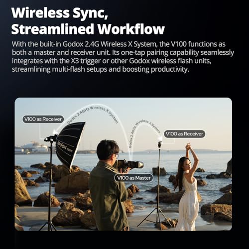 - اقتران بنقرة واحدة مع X3: مع نظام جودوكس اللاسلكي 2.4G المدمج، يعمل V100 كوحدة رئيسية وجهاز استقبال. تتكامل قدرة الاقتران بنقرة واحدة بسلاسة مع مشغل X3 أو وحدات الفلاش اللاسلكية غودوكس الأخرى، مما يبسط إعدادات الفلاش المتعدد ويعزز الإنتاجية.