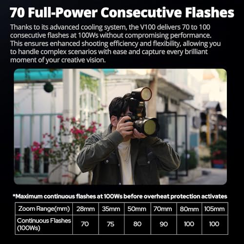 - 70 وميض متتالي كامل الطاقة: بفضل نظام التبريد المتقدم، يوفر V100 70 إلى 100 ومضة متتالية عند 100 واط دون المساس بالأداء. يضمن ذلك تحسين كفاءة التصوير والمرونة، مما يسمح لك بالتعامل مع السيناريوهات المعقدة بسهولة والتقاط كل لحظة رائعة من رؤيتك الإبداعية.