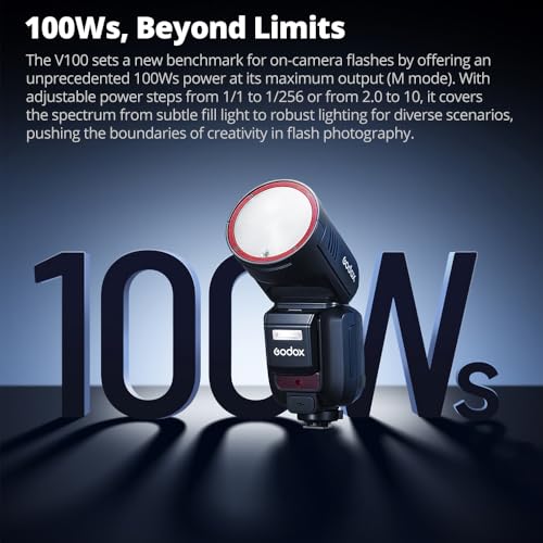 - 100 واط، ما وراء الحدود: يضع V100 معيارًا جديدًا لمضات الكاميرا من خلال توفير طاقة غير مسبوقة 100 واط بأقصى خرج (وضع M). مع خطوات طاقة قابلة للتعديل من 1/1 إلى 1/256 أو من 2.0 إلى 10، فإنه يغطي الطيف من ضوء التعبئة الدقيق إلى الإضاءة القوية لسيناريوهات متنوعة، مما يدفع حدود الإبداع في التصوير الفوتوغرافي بالفلاش
