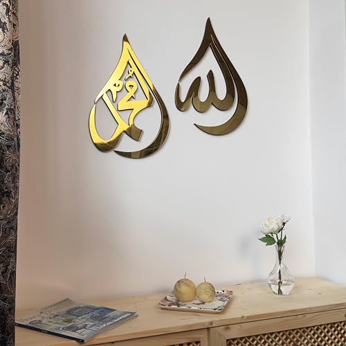 لوحات جدارية من ايوا كونسبت، ديكور جداري معلق لغرفة المعيشة وغرفة الصلاة بتصميم حرف الله ومحمد، لون ذهبي، مقاس 45.72 × 30.48 سم، مجموعة من 3 قطع